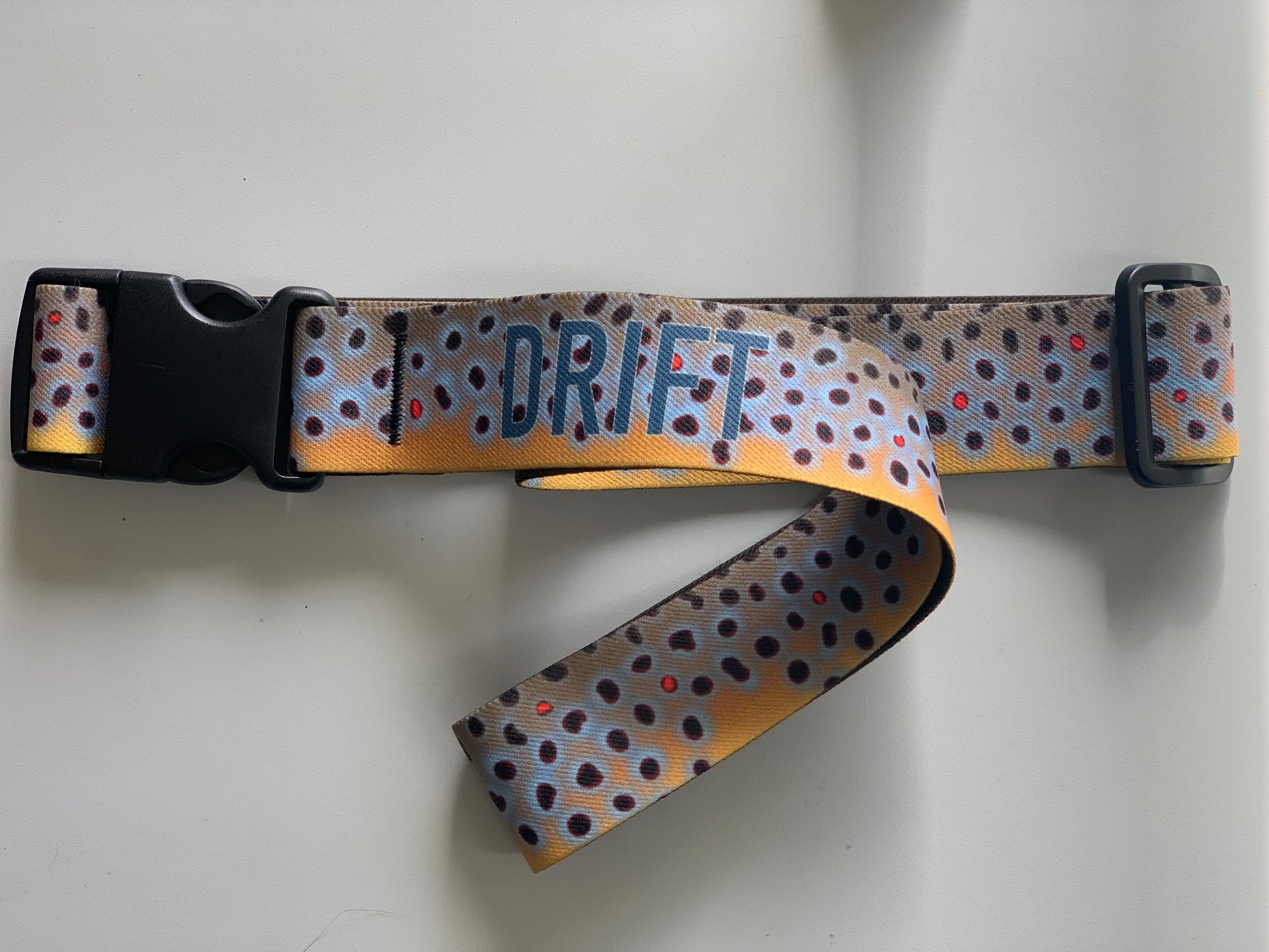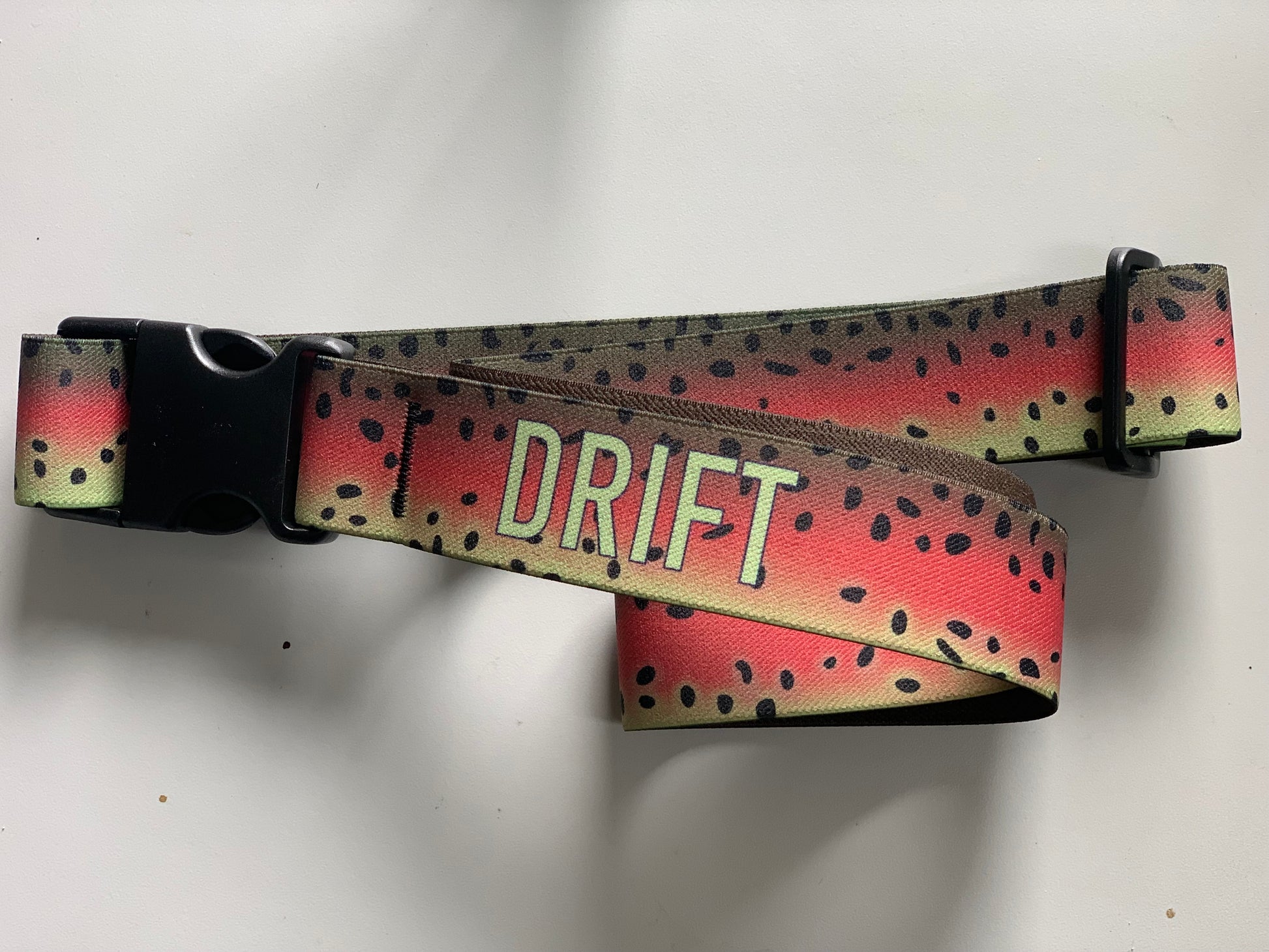THIS 1.5" WIDE X 52" LONG ELASTIC WADING BELT WITH HEAVY DUTY PLASTIC SIDE RELEASE BUCKLES FEATURES LIFE LIKE TROUT PATTERNS. IT IS FULLY ADJUSTABLE TO MOST WAIST SIZES WITH THE ABILITY TO ADJUST TO DESIRED TIGHTNESS. THE VIVID COLORS ARE FADE AND BLEED RESISTANT, INSURING LONG LASTING WEAR.